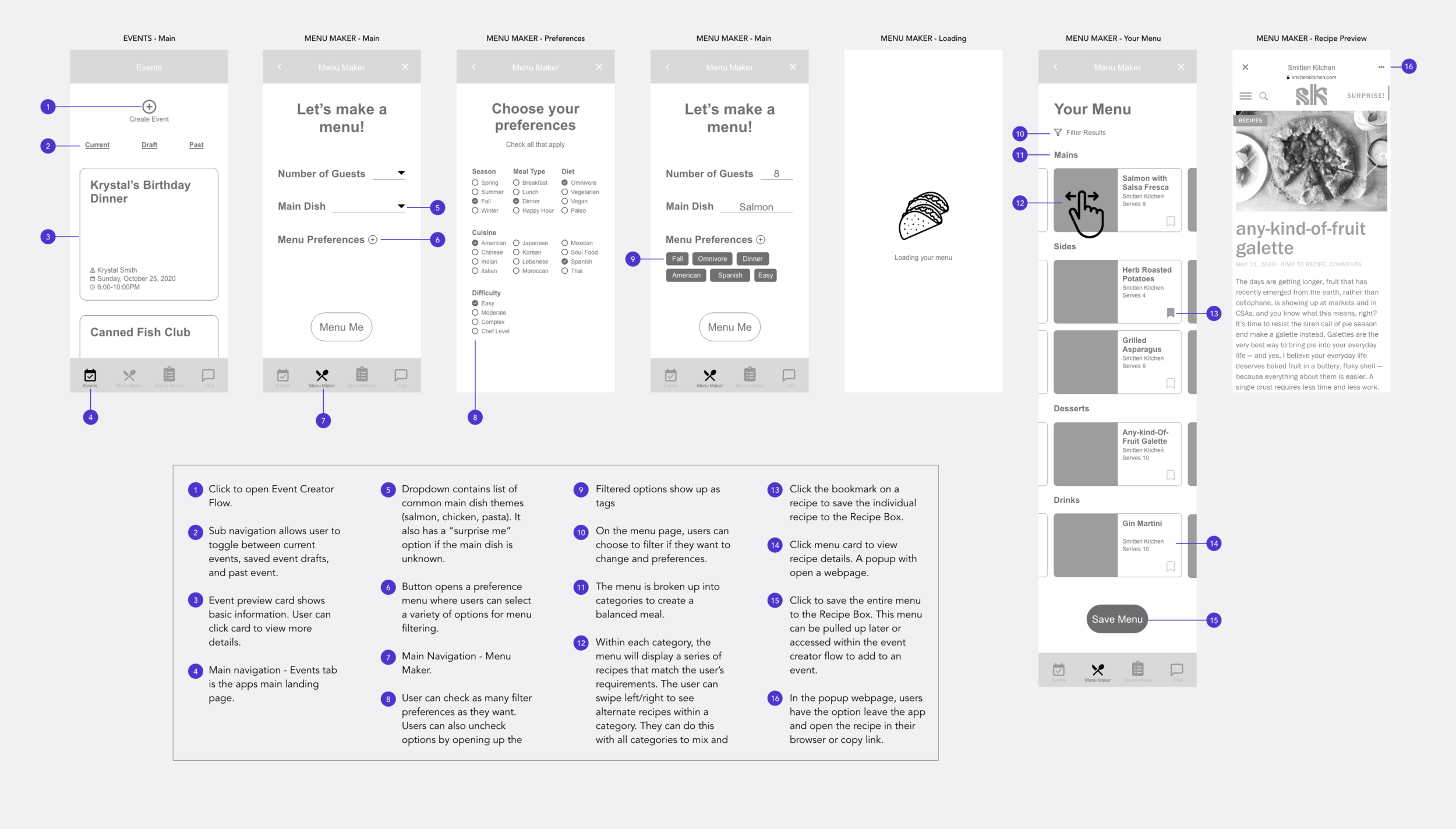 The Dinner Party app has 2 primary components; Event Creator and Menu Maker. These two tools work hand-in-hand and have easy to follow steps. Menus can be designed and saved for later in the Recipe Box or assembled during the Event Creator flow.