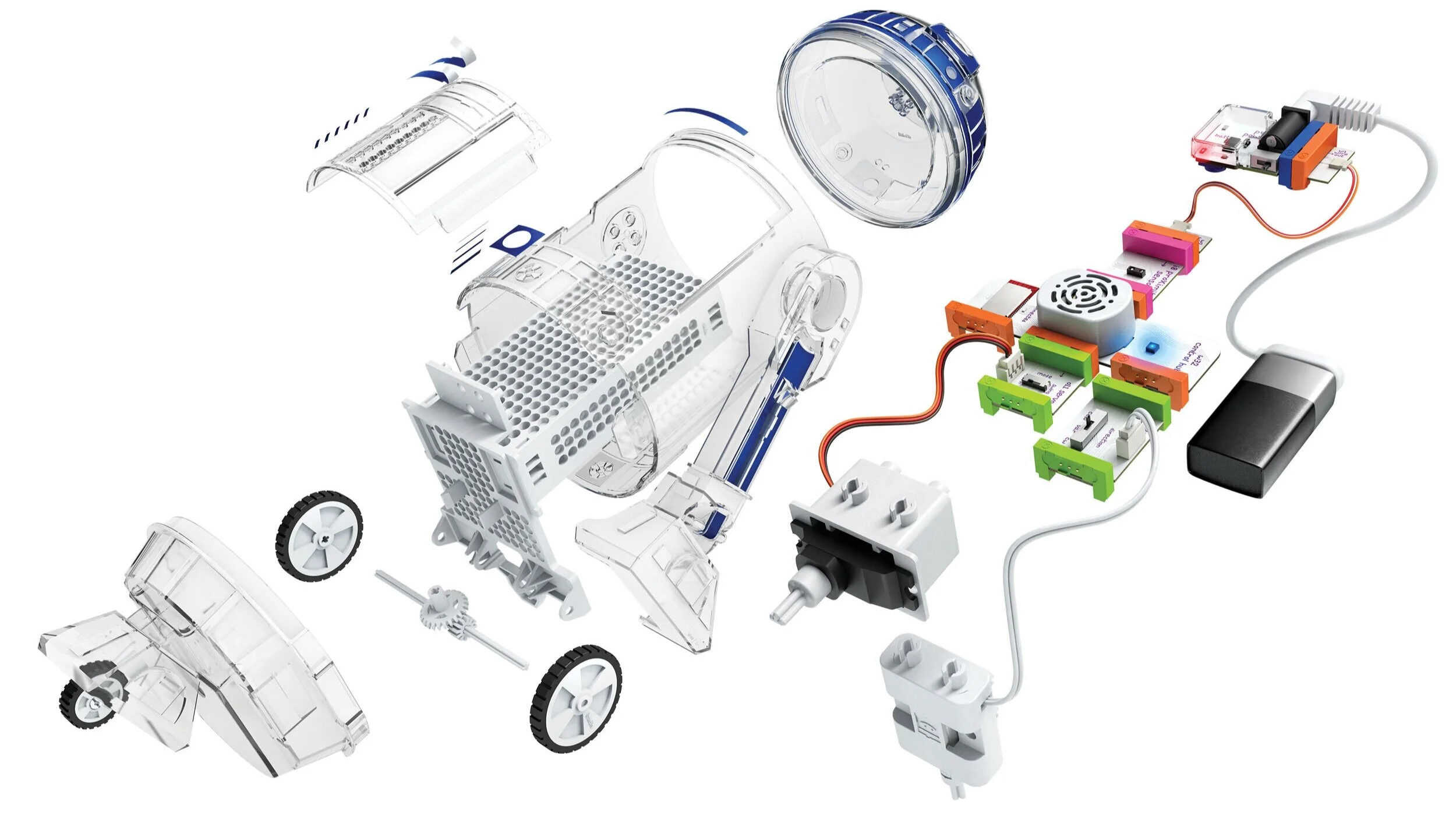 The Droid Inventor Kit empowers kids to create their own droid and bring it to life using littleBits electronic blocks. With the Droid Inventor app, they can control their droid and give it new abilities with easy block-based coding. Kids can level-up their inventor expertise by reconfiguring their droid to give it new skills, or design any droid they can dream up.