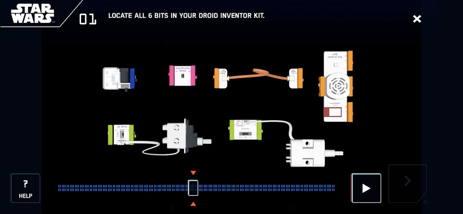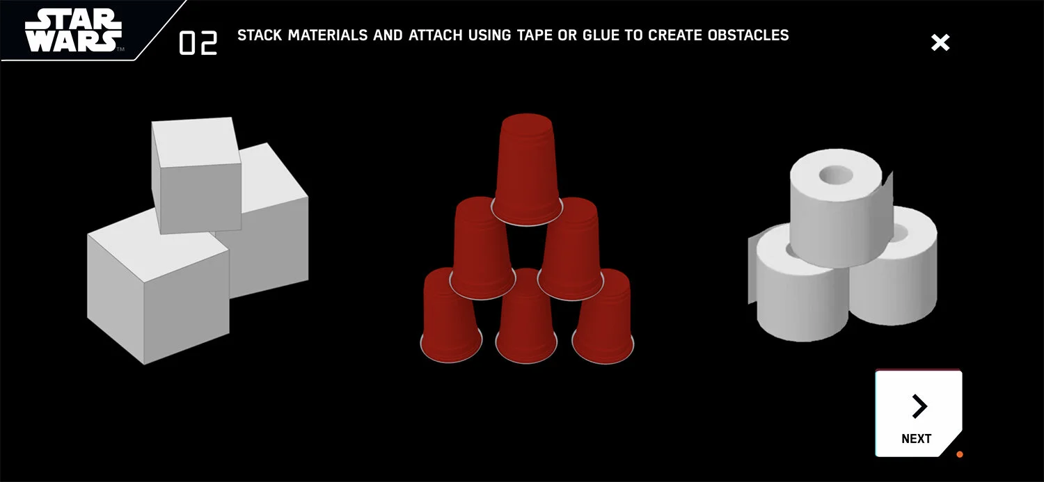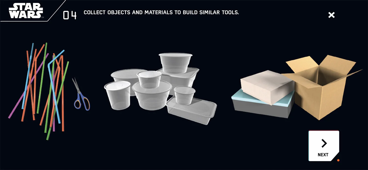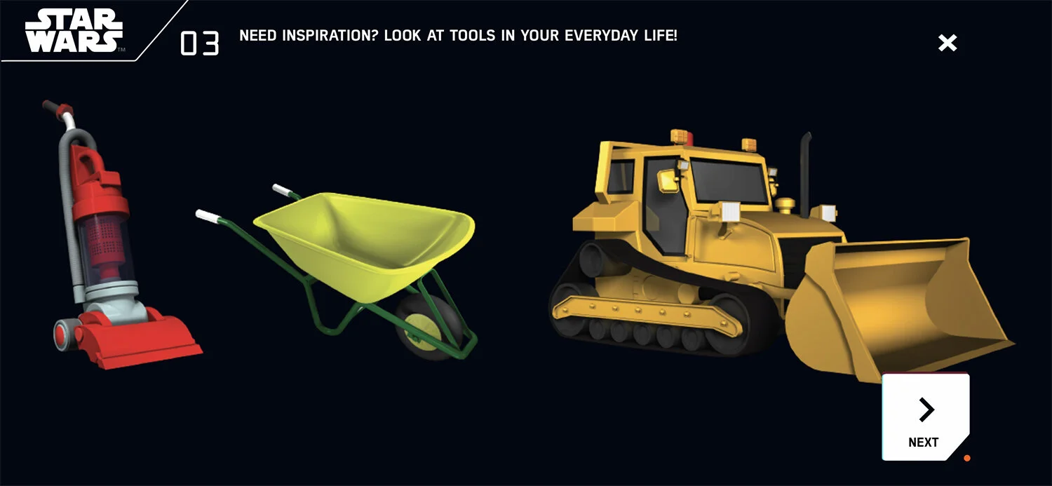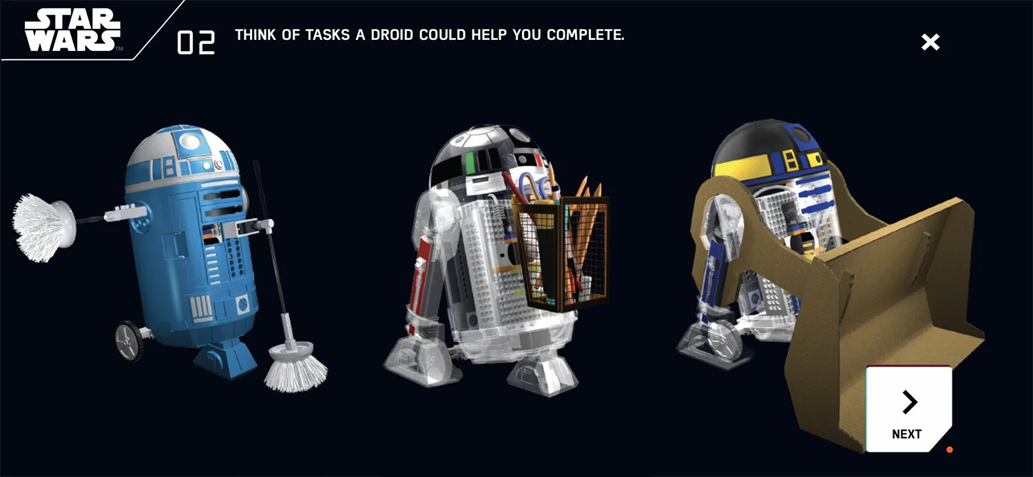 The user experience parallels the kid’s journey as an inventor with a Star Wars narrative. As kids become more confident, they move into their own narrative as droid inventor.