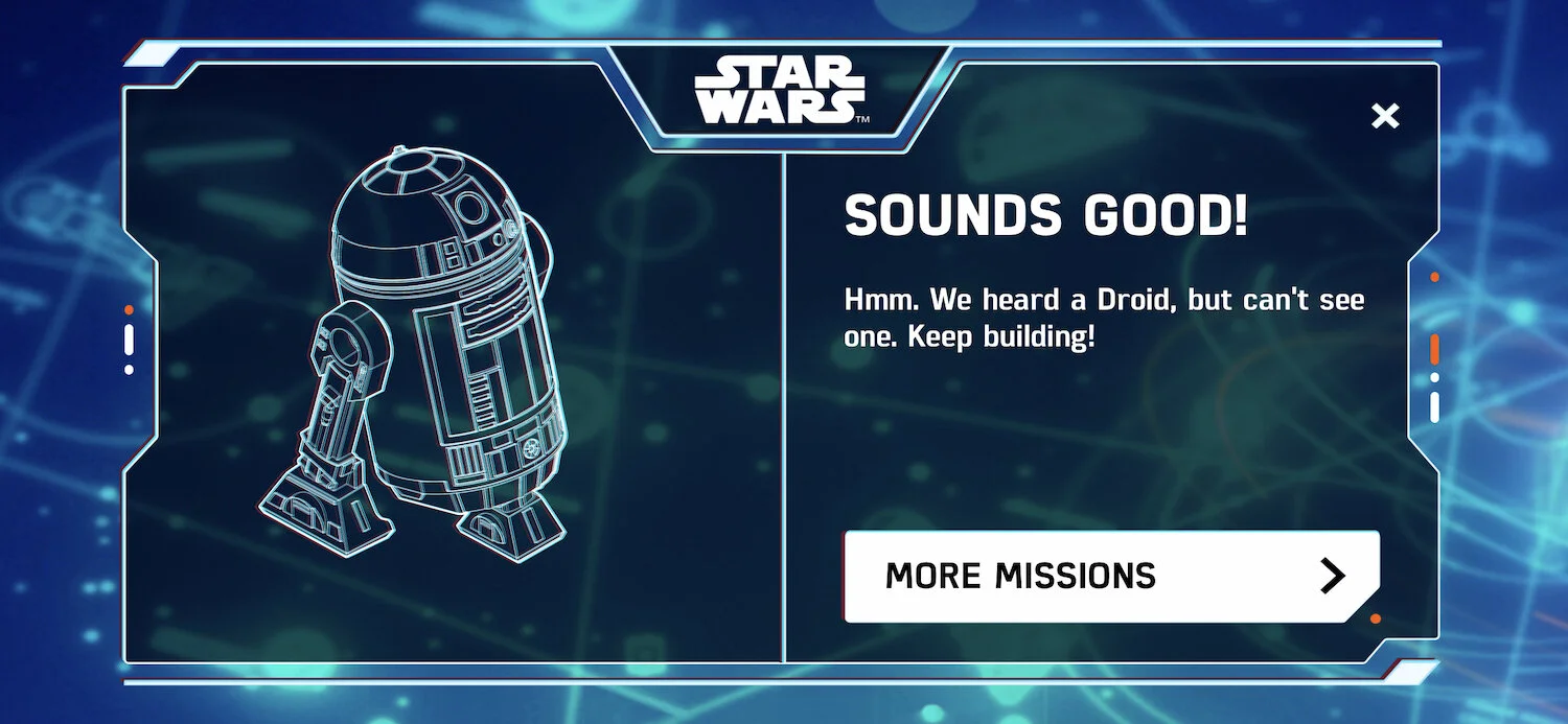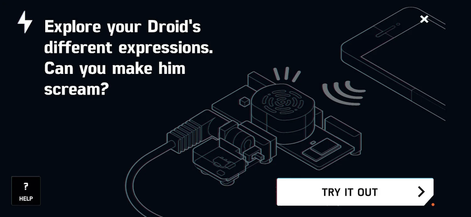 We added “locks” to ensure that key moments were not missed, and certain steps yielded rewards. For example, when you first connect your circuit to the phone, you gain access to all of R2’s classic sound effects.
