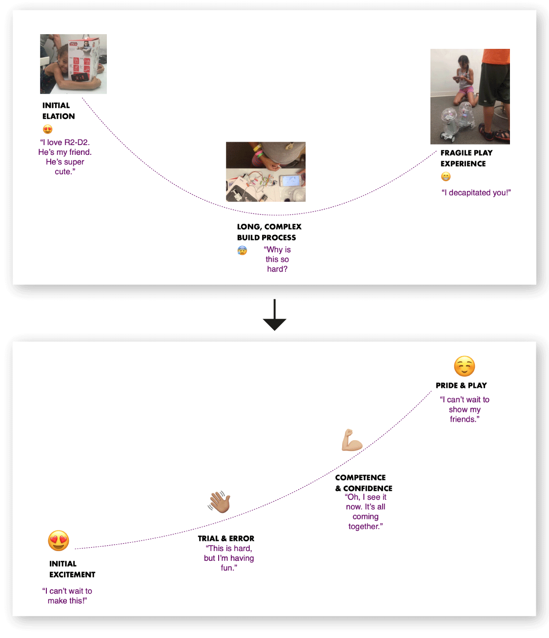 From user testing, we knew that we had to start kids off with as few variables as possible. There was a lot to learn when building the droid - from understanding how littleBits work as a system, to connecting the droid’s circuit to controls on your phone, to the actual physical assembly of the droid. The user journey was designed to help kids level up, build skills, and feel accomplished along the way.